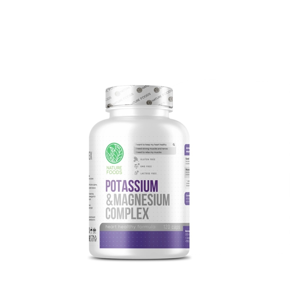 Nature Foods Magnesium Complex + Potassium — это комплексная формула для поддержки сердца, нервной системы, мышечного тонуса и энергетического обмена. Сочетание магния и калия помогает нормализовать электролитный баланс, снижает усталость, предотвращает судороги и поддерживает стабильную работу сердечно-сосудистой системы.