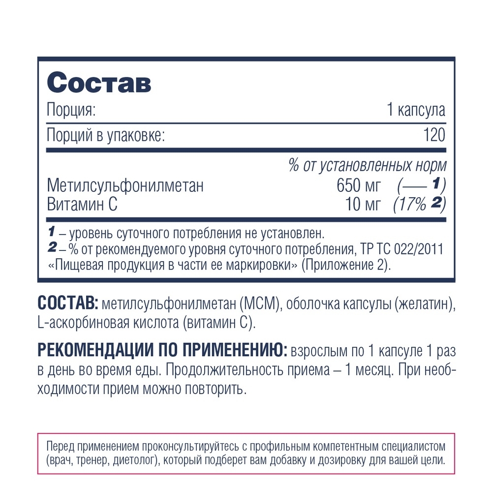 - MSM участвует в синтезе ряда важнейших белков – в том числе коллагена, гемоглобина, кератина, что укрепляет связочный аппарат, улучшает состояние кожи, ногтей, волос и улучшает снабжение тканей кислородом,
