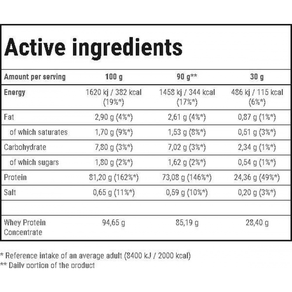 В состав 100% WHEY входит исключительно сывороточный белок, без примесей, снижающих содержание протеина в продукте. Концентрат сывороточного белка – это один из наиболее популярных и эффективных протеинов природного происхождения. Продукт идеально компенсирует недостаток белка, который возникает при повышенной потребности организма у людей, занимающихся профессиональным спортом, культуризмом, а также у людей, находящихся на диете для похудения.